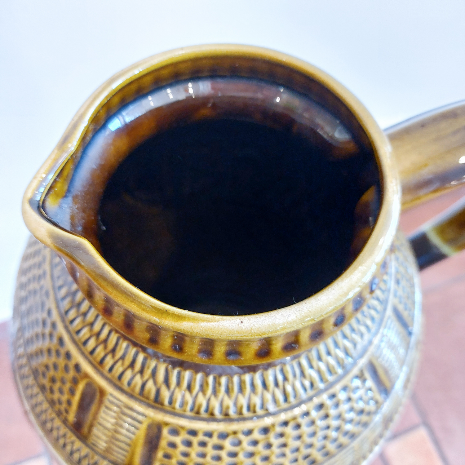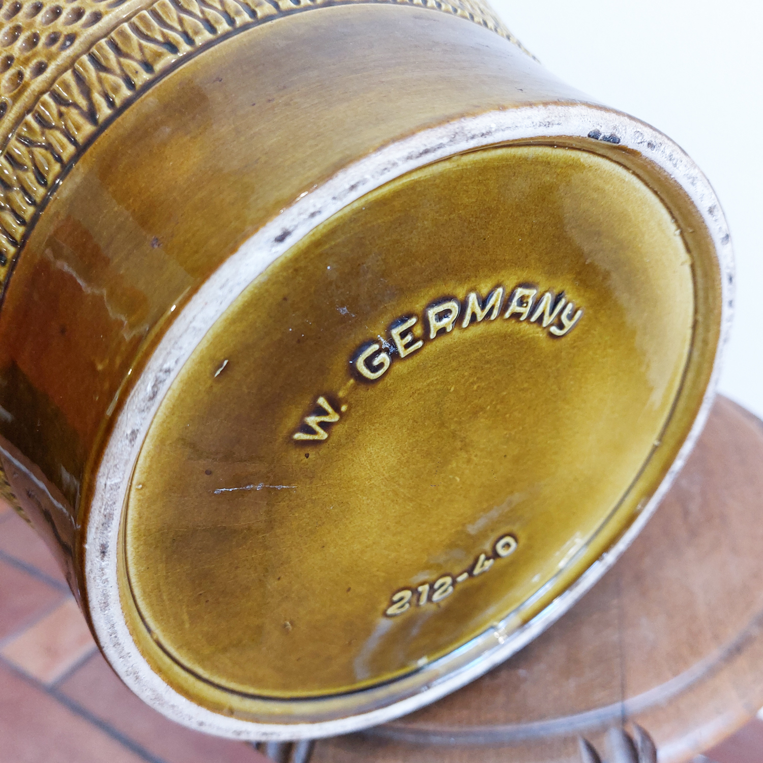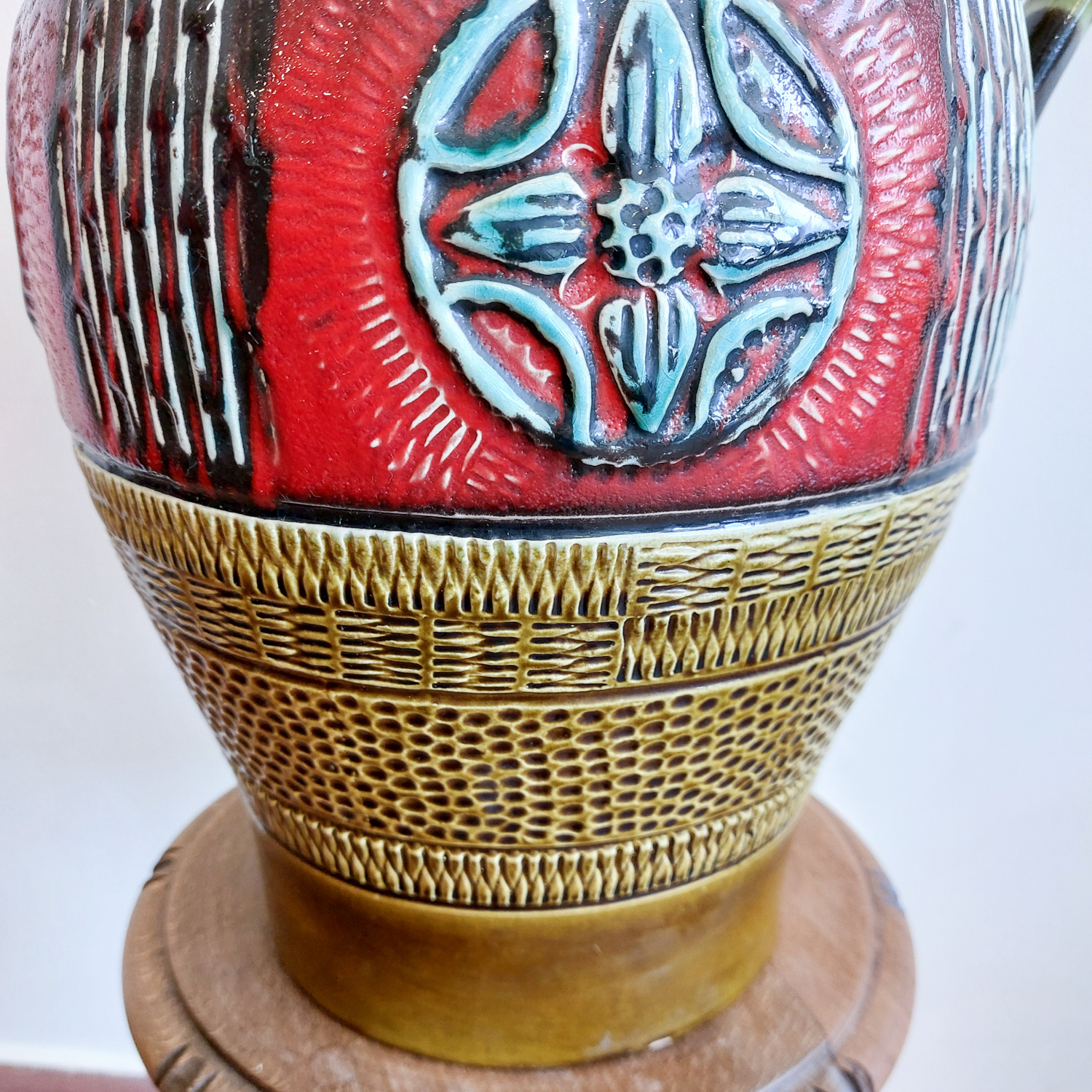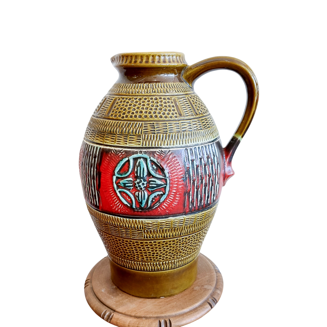 Vintažinė keramikinė vaza „Fat Lava“ stiliuje, pagaminta apie 1960 m. Vakarų Vokietijoje. Ryškus dekoras su reljefine gėle, raudonos ir alyvuogių spalvos derinys, išraiškingi faktūriniai raštai. Žymėta „W. Germany 212-40“.