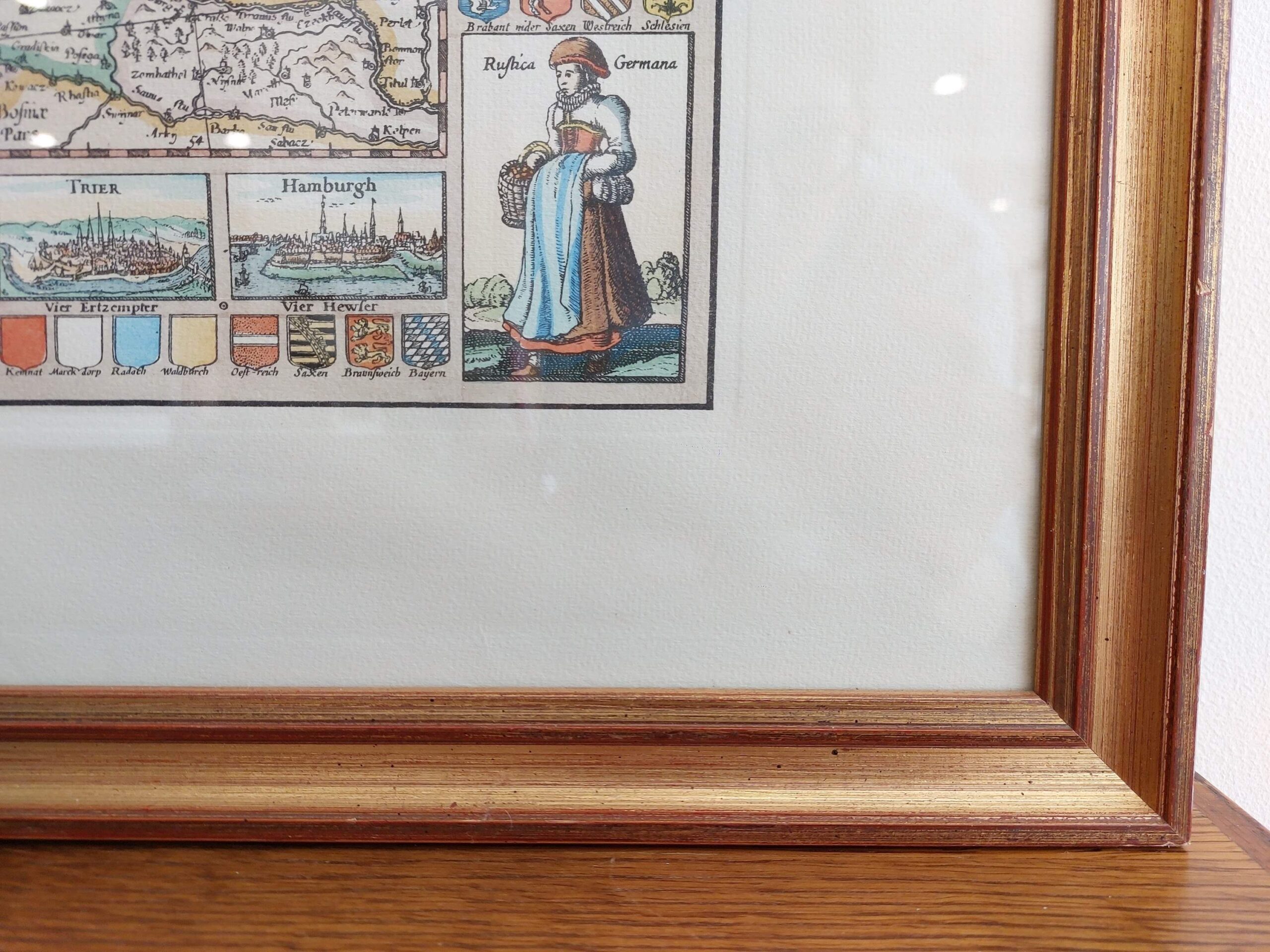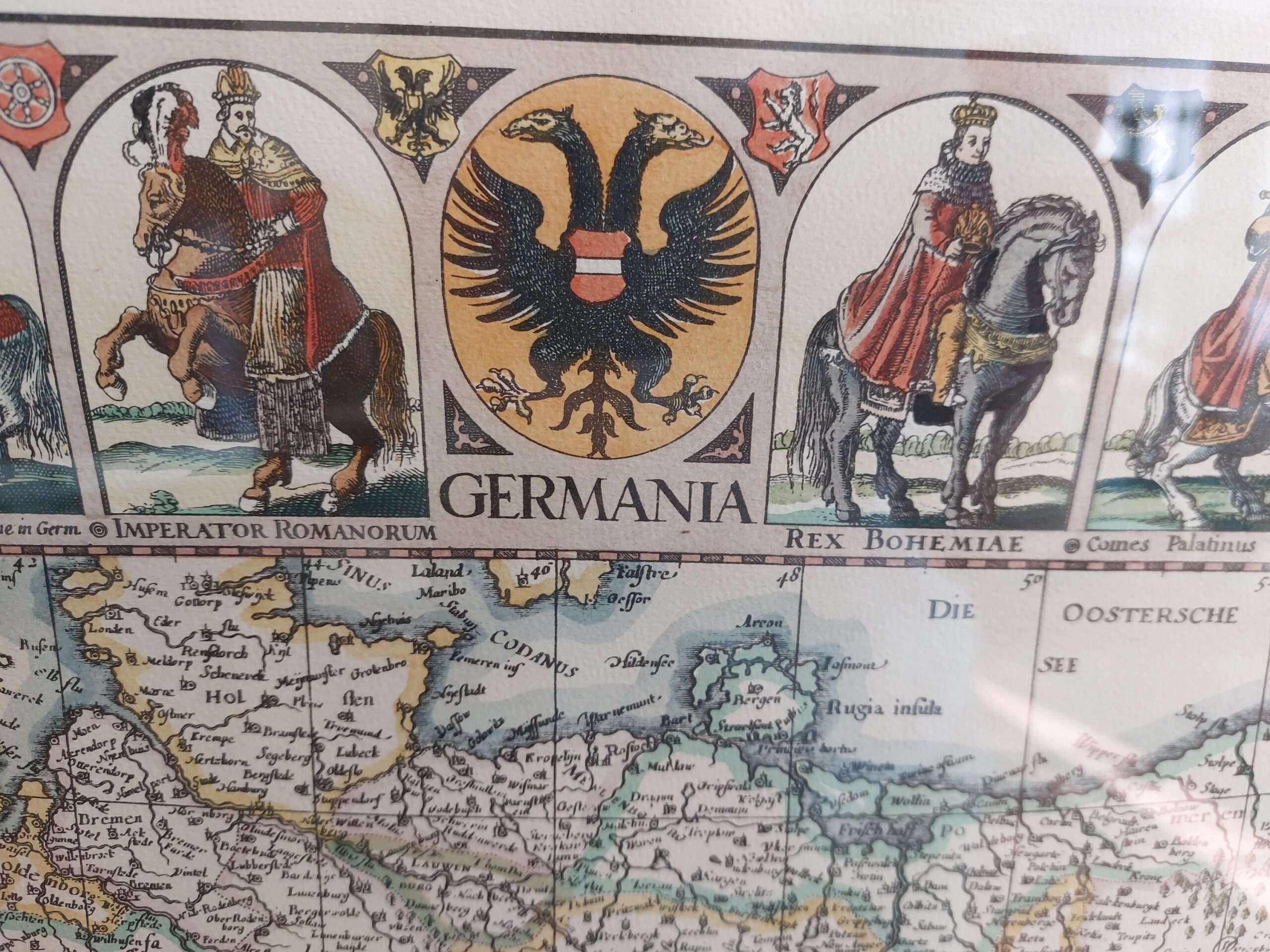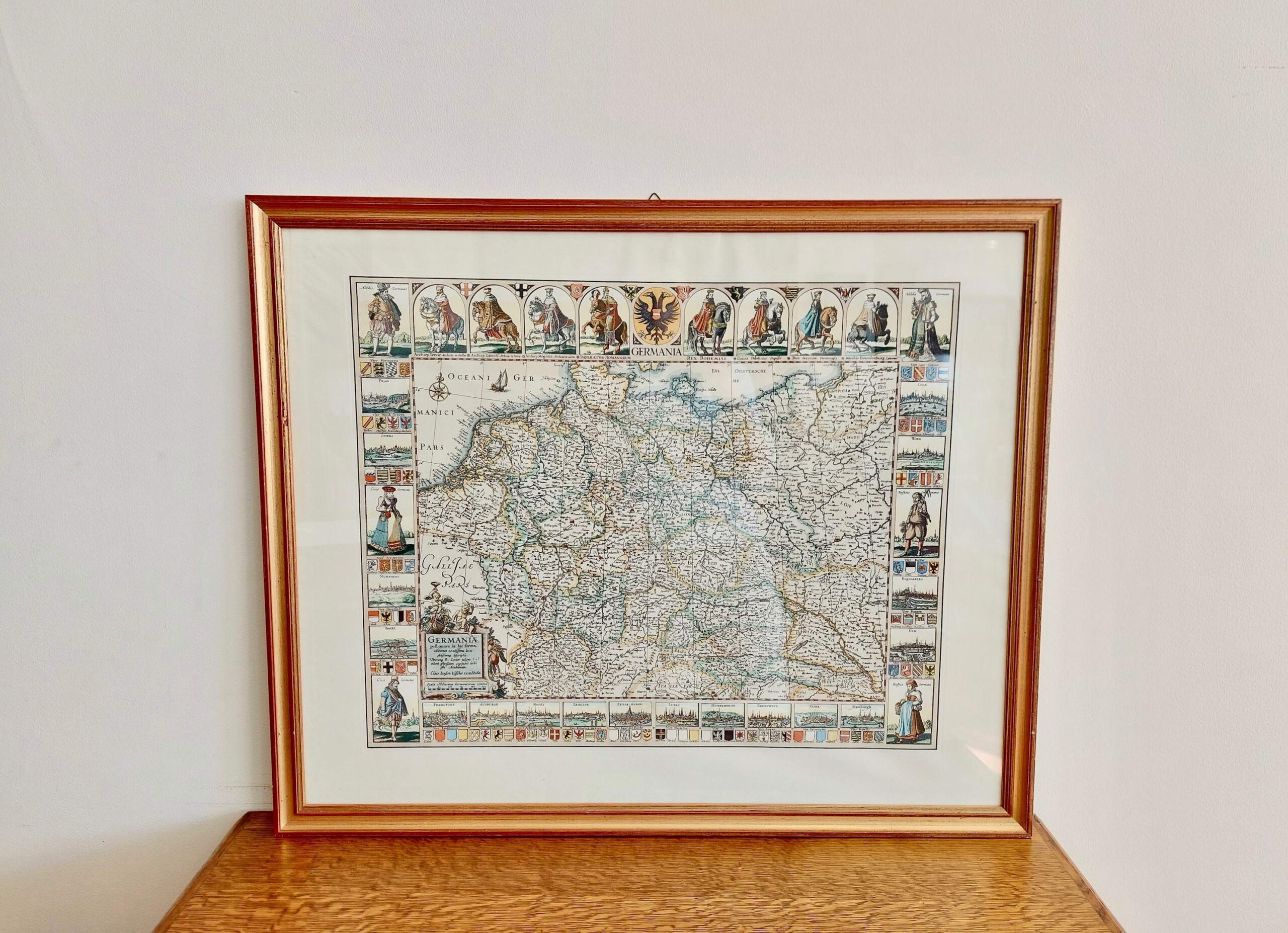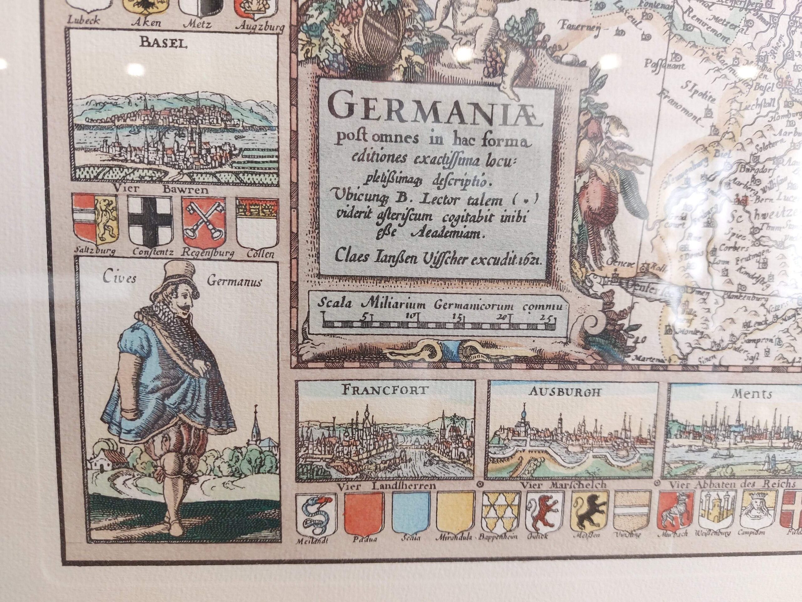 Detali, spalvota „Germania“ žemėlapio reprodukcija, remiantįsi 1652 m. Claes Janszoon Visscher originalu. Žemėlapyje vaizduojamos Šventosios Romos imperijos žemės, miestų panoramos, herbiniai ženklai ir tautiniai kostiumai. Kompozicija dekoratyvi, istorinė ir puikiai tinkanti klasikiniam interjerui ar biuro dekorui.