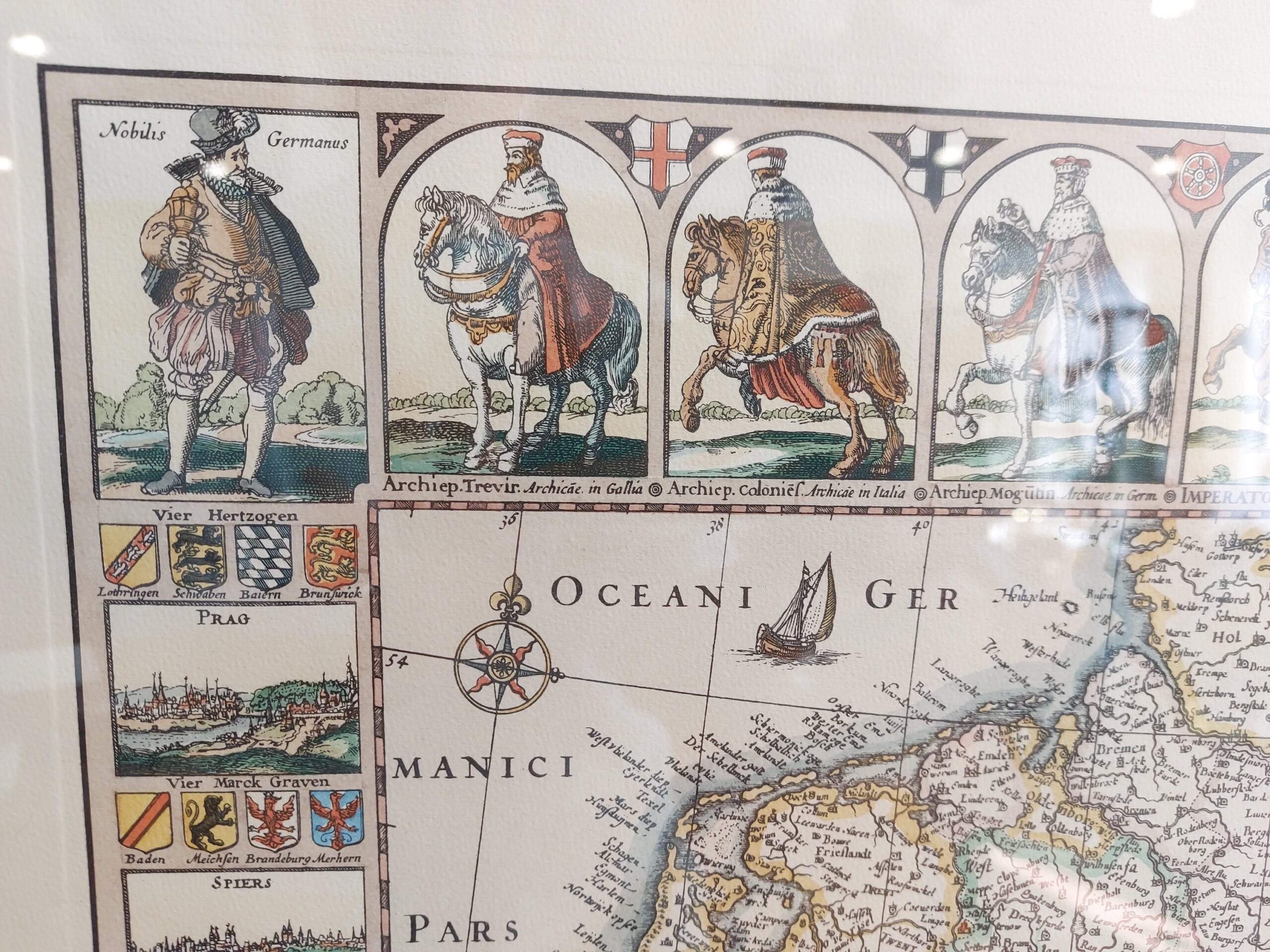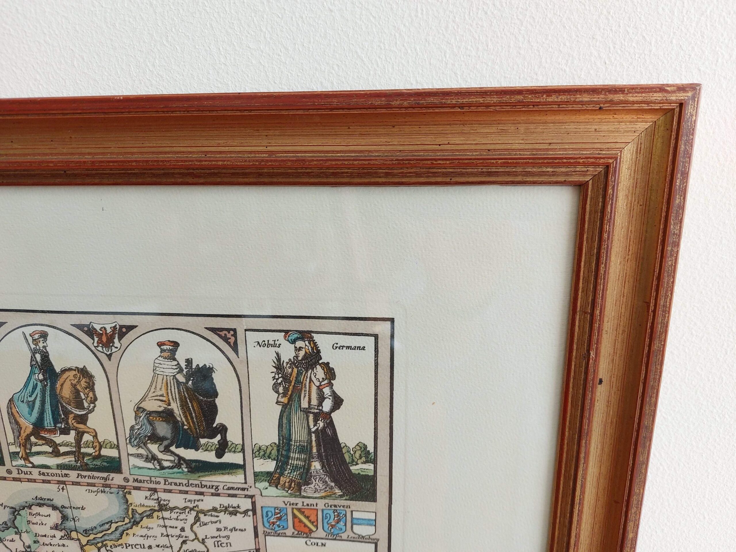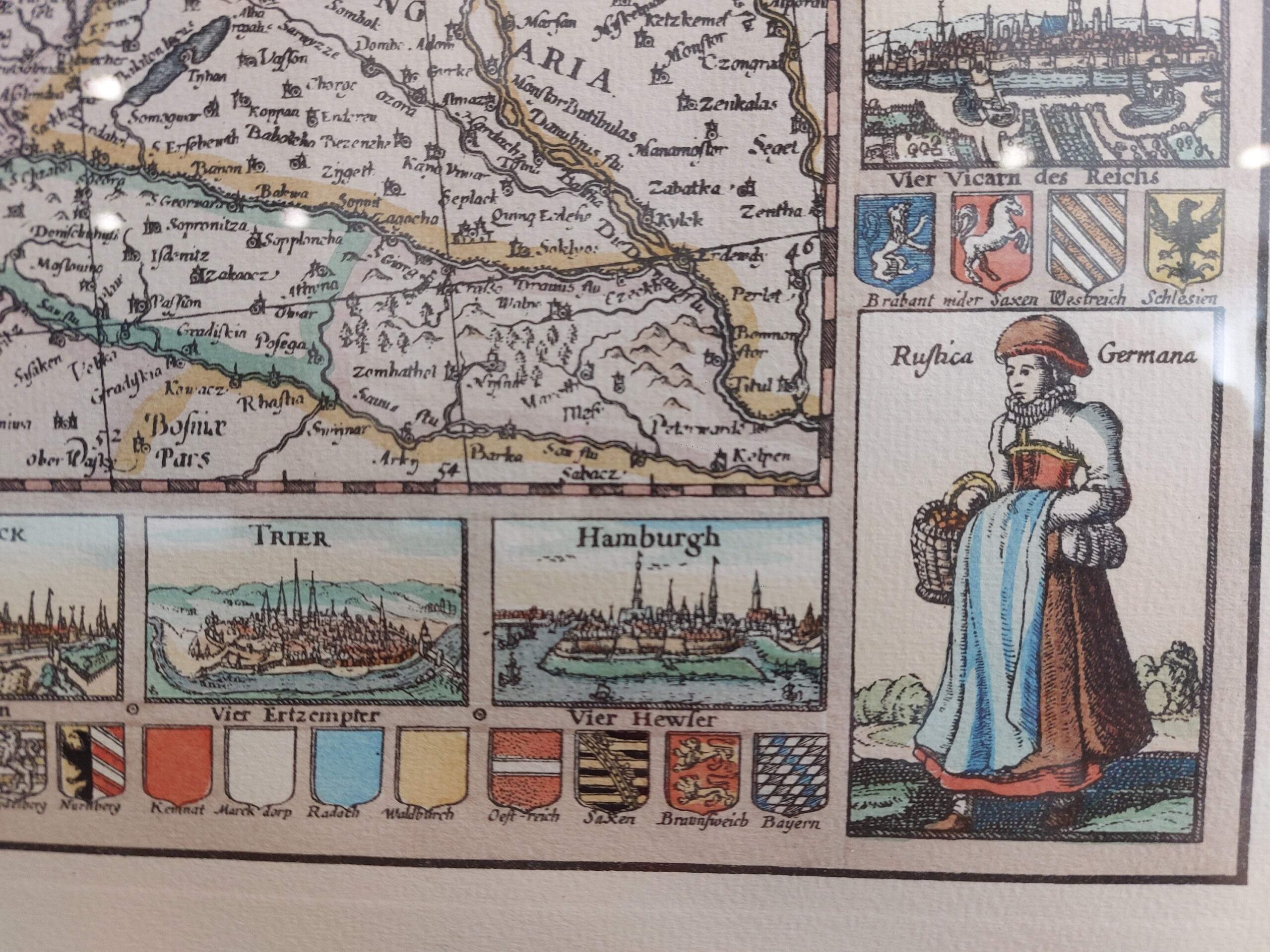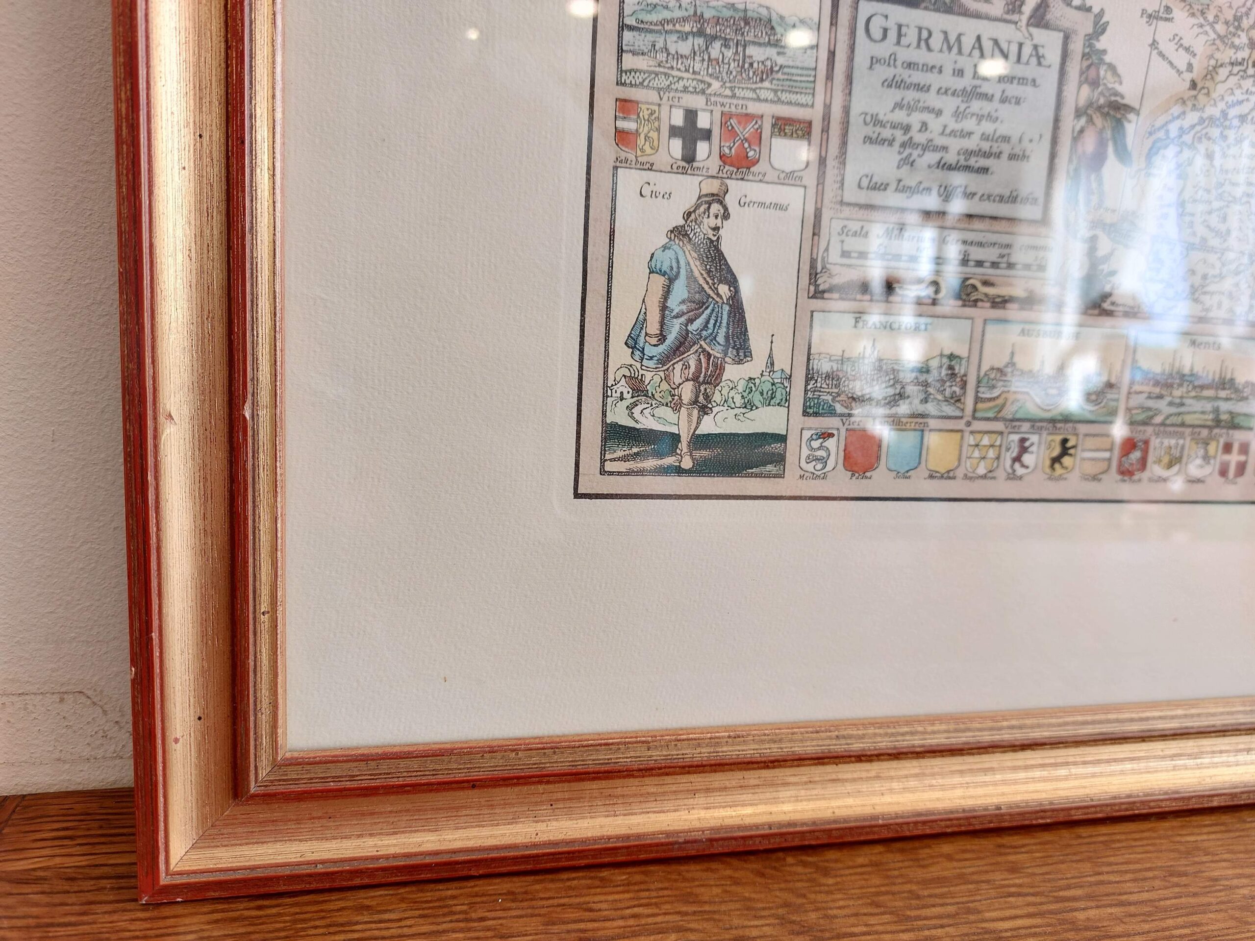Detali, spalvota „Germania“ žemėlapio reprodukcija, remiantįsi 1652 m. Claes Janszoon Visscher originalu. Žemėlapyje vaizduojamos Šventosios Romos imperijos žemės, miestų panoramos, herbiniai ženklai ir tautiniai kostiumai. Kompozicija dekoratyvi, istorinė ir puikiai tinkanti klasikiniam interjerui ar biuro dekorui.