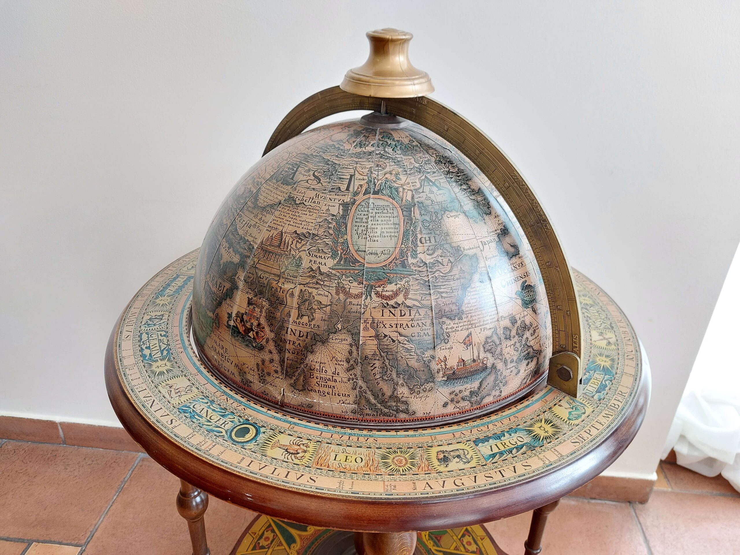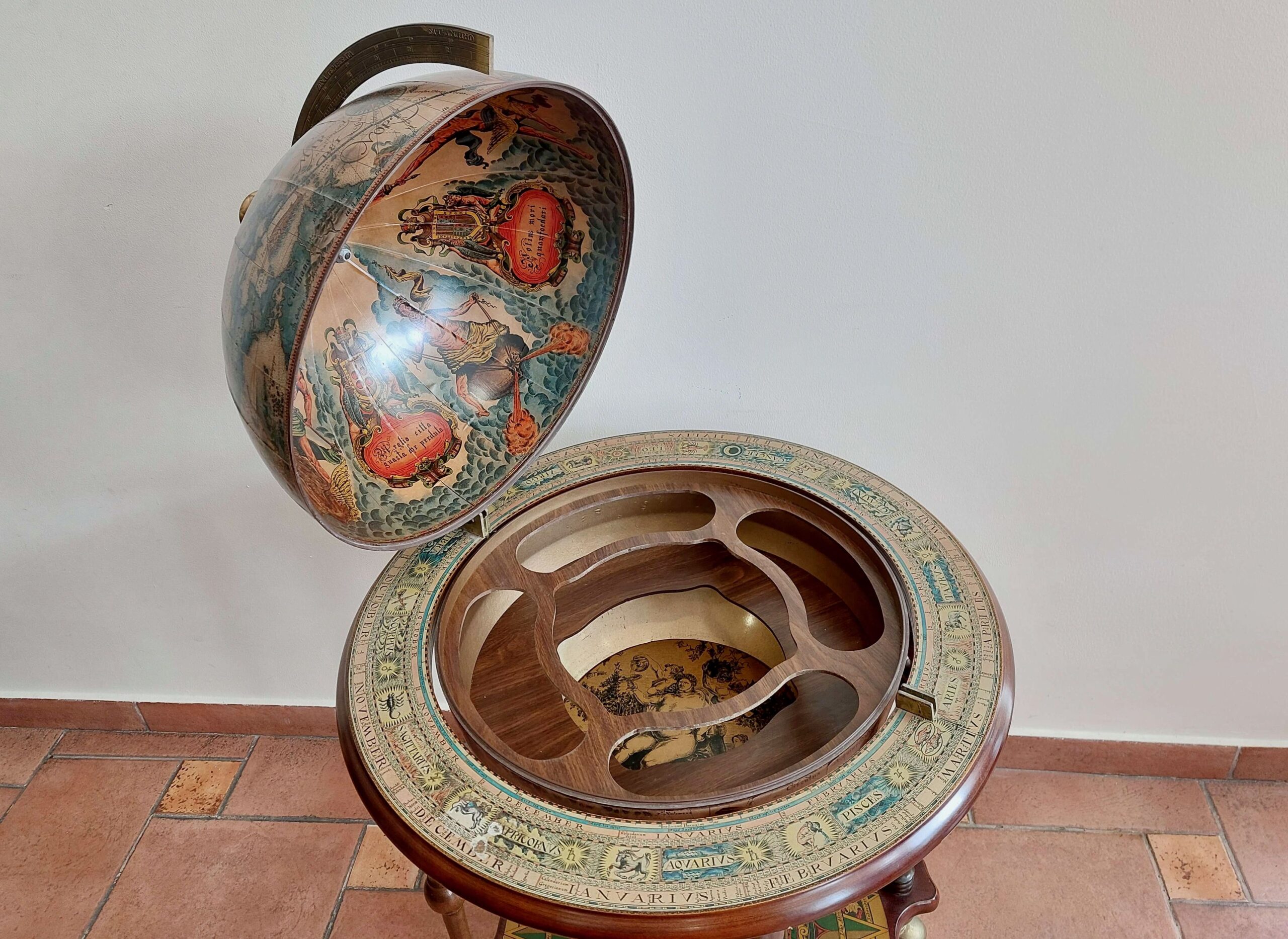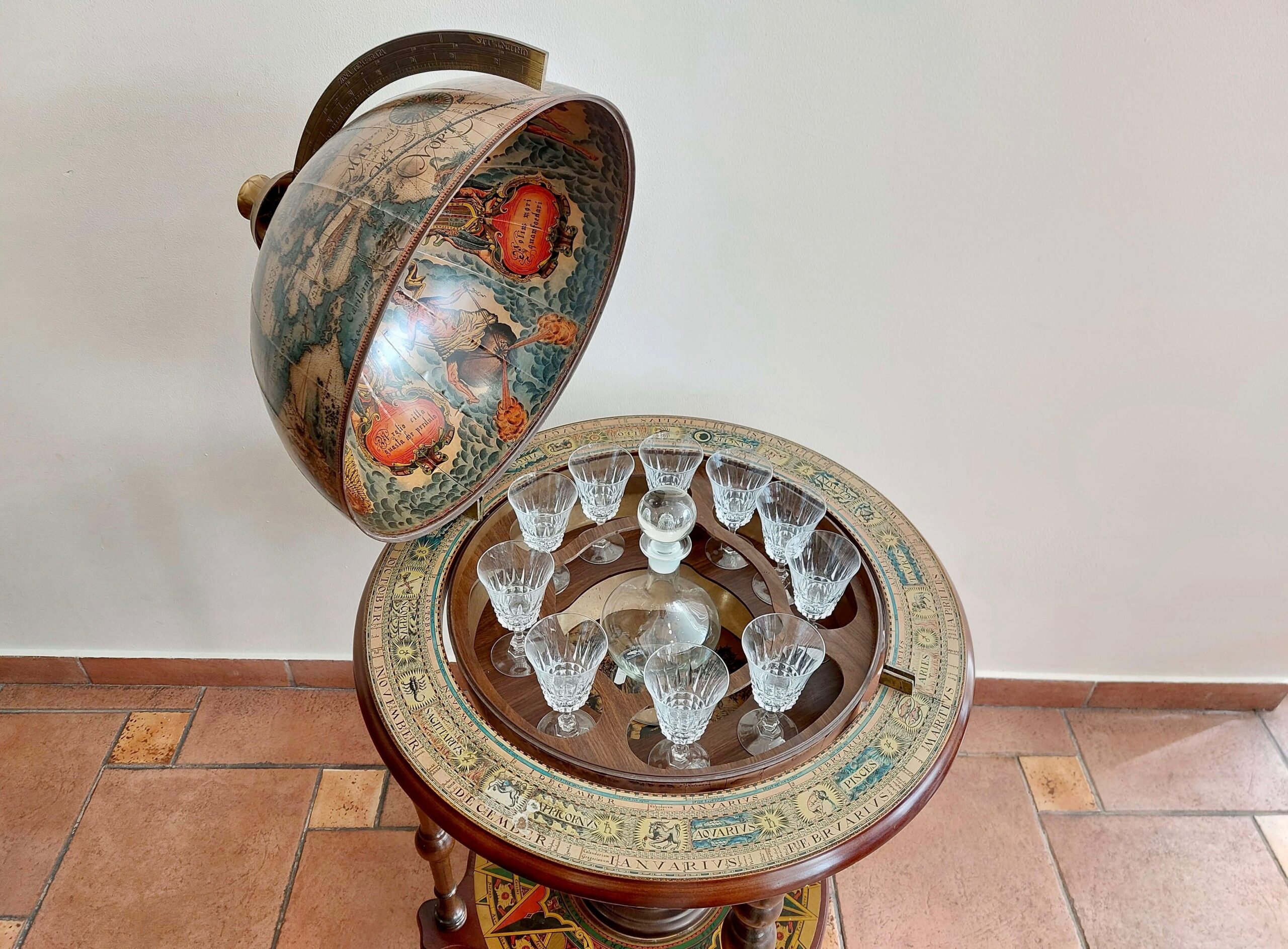Vintažinis baro gaublys, parvežtas iš Prancūzijos. Datuojamas apie 1960 m. Tai dekoratyvus ir kartu praktiškas interjero baldas su senovinio žemėlapio spauda. Gaublys atsidaro – viduje įrengtas baro skyrius keliems buteliams ir taurelėms. Dekoras perteikia XVI–XVII a. pasaulio žemėlapių stilistiką: lotyniški vėjų pavadinimai, zodiako ženklai, kompaso motyvai. Gaublys lengvos konstrukcijos, nestandartinio dydžio, stovi ant ratukų – galima patogiai judinti. Yra naudojimo žymių: kraštuose – pažeidimų, spauda vietomis pasitrynusi, bet bendra būklė – stabili, daiktas tinkamas naudoti ir eksponuoti.