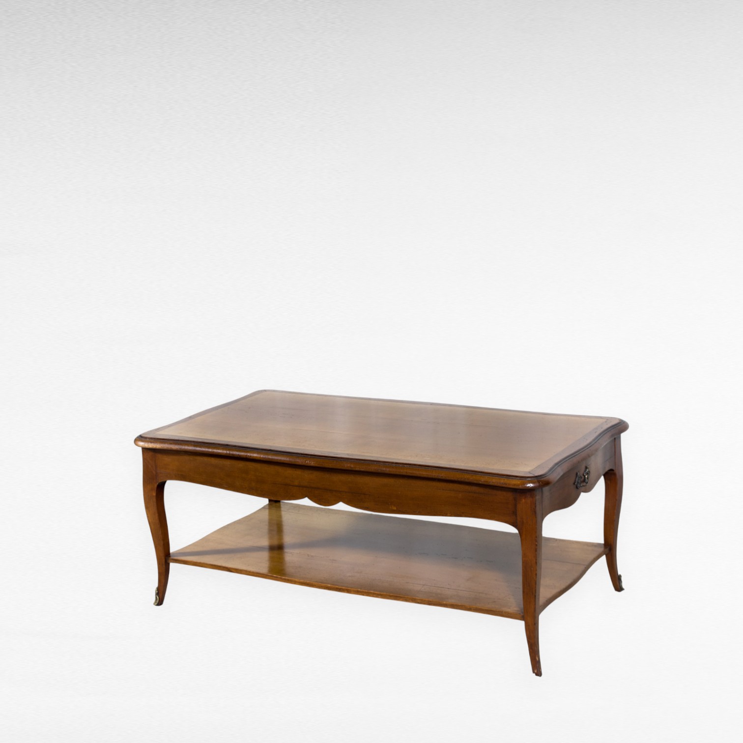 Vintažinis žurnalinis staliukas, XX a. vid., atvežtas iš Prancūzijos. Banguoti kraštai, lenktos kojelės, šoninis stalčius su metaline rankenėle. Kojeles puošia žalvario apkaustai, vieno trūksta. Apačioje papildoma lentyna. Matosi naudojimo pėdsakai, tačiau staliukas išlikęs tvirtas ir praktiškas.