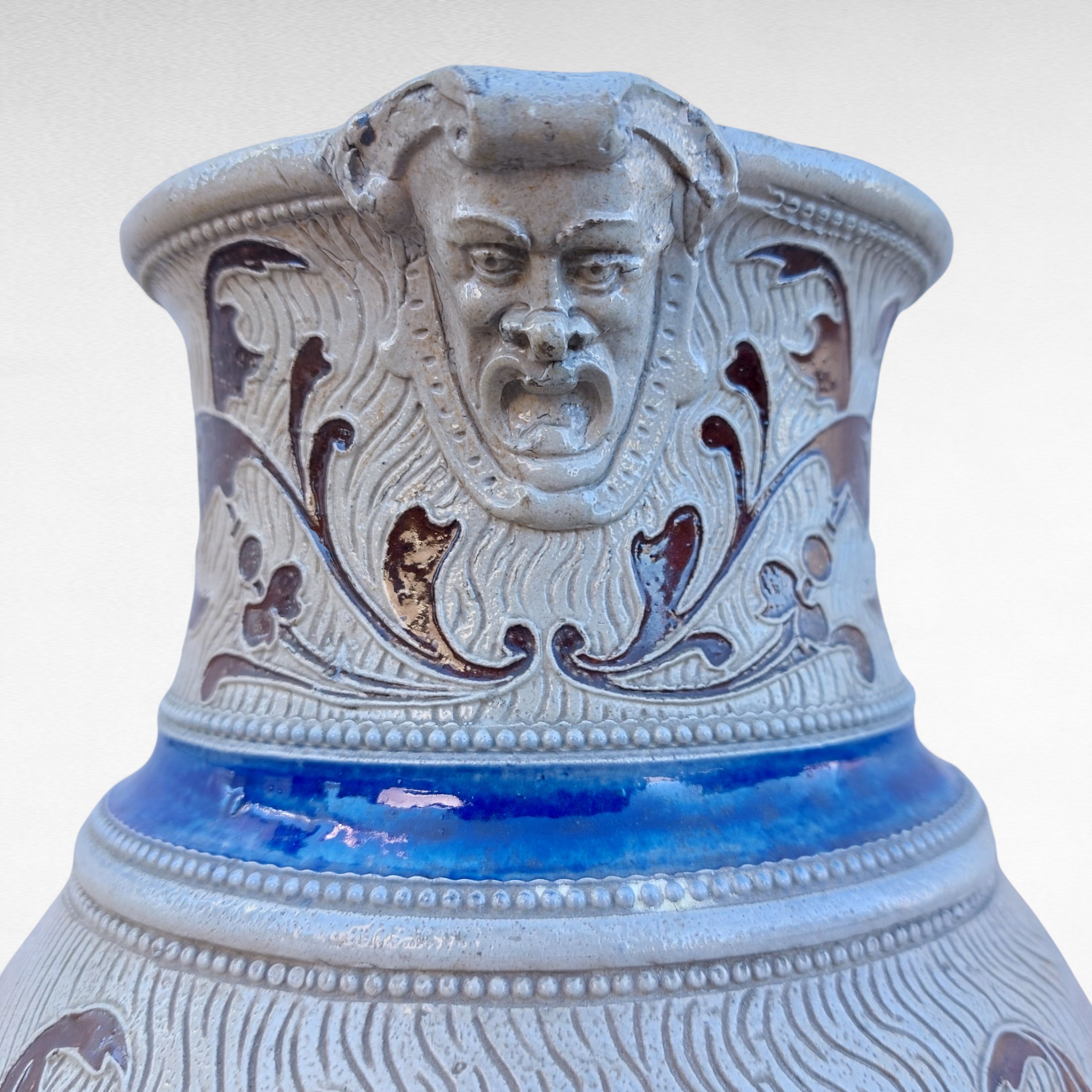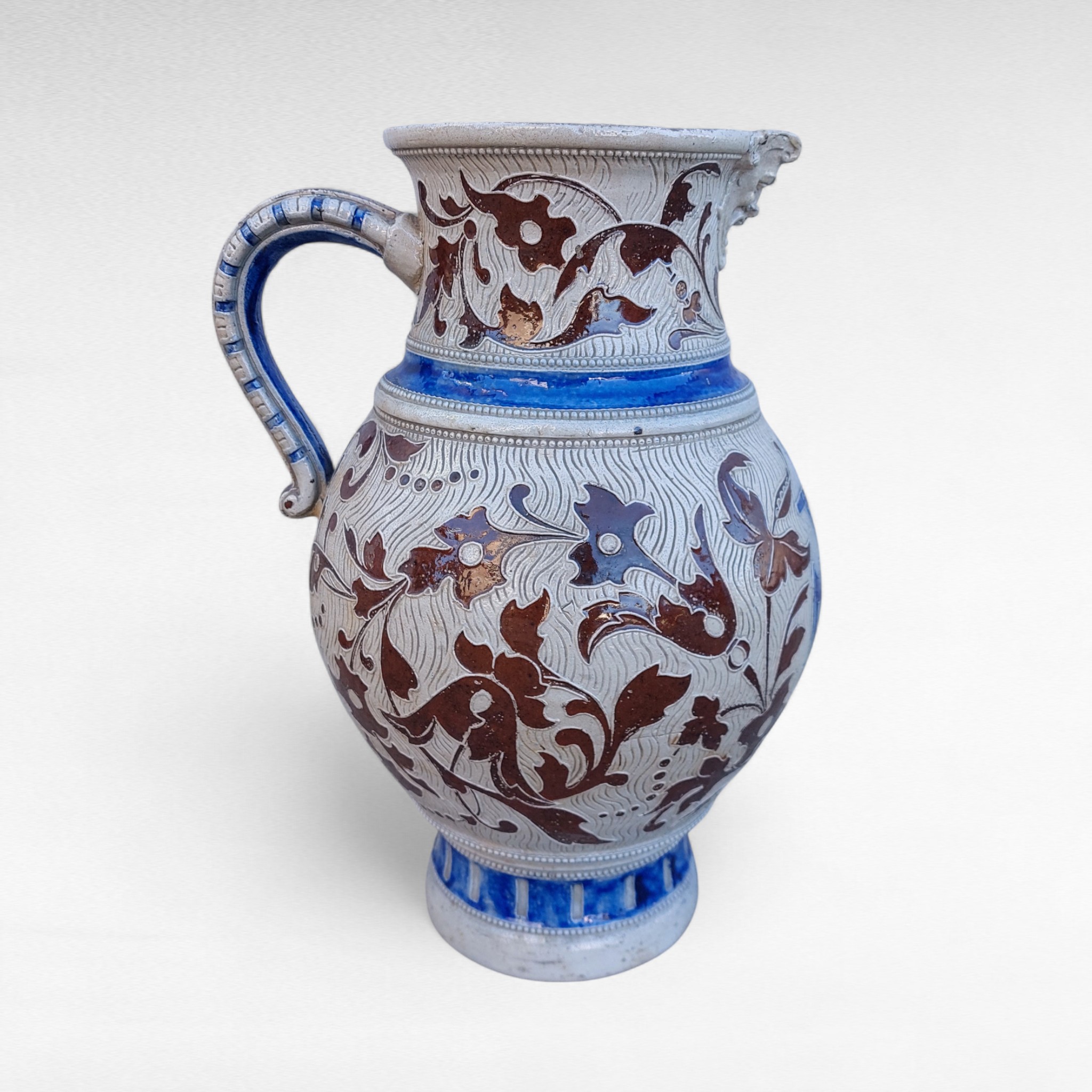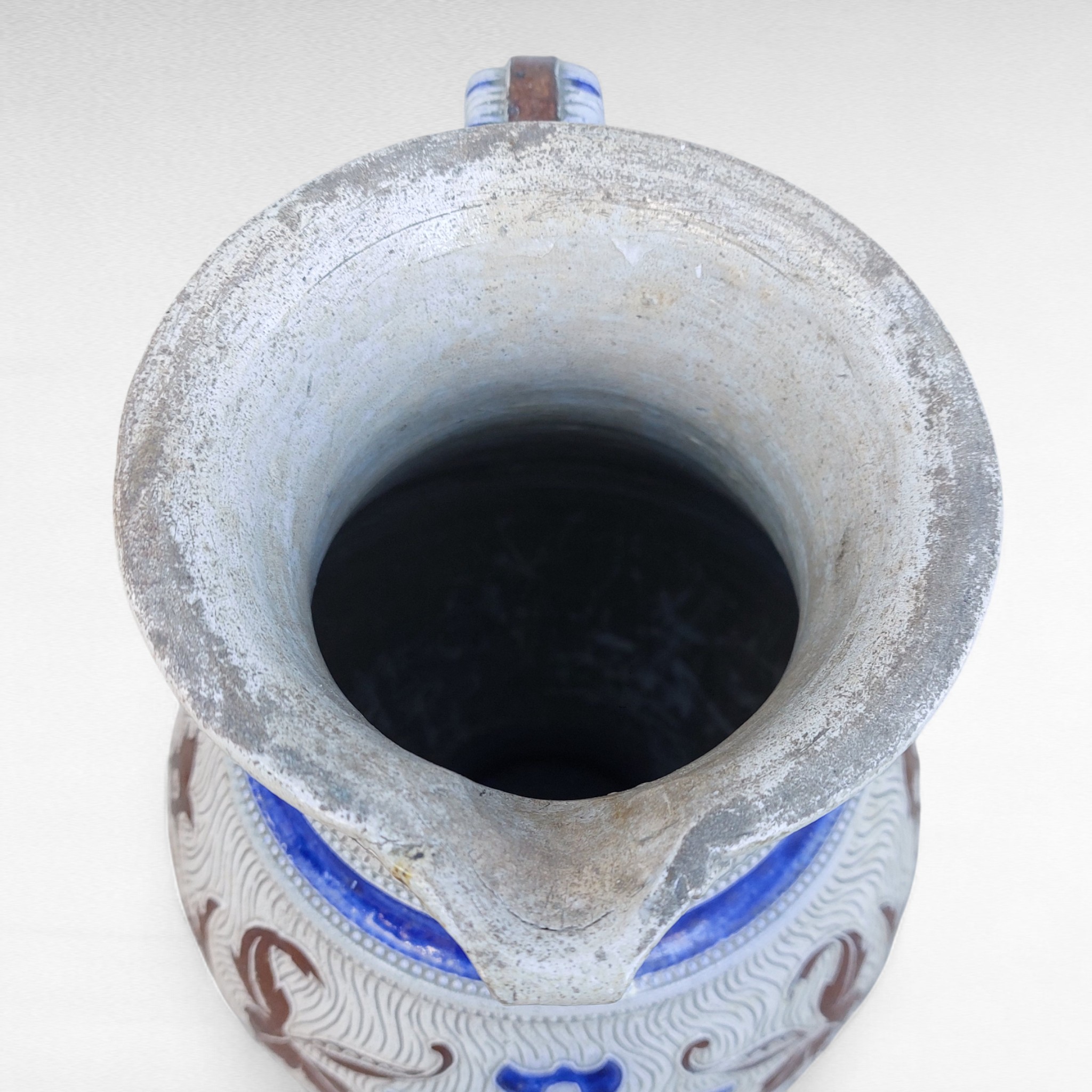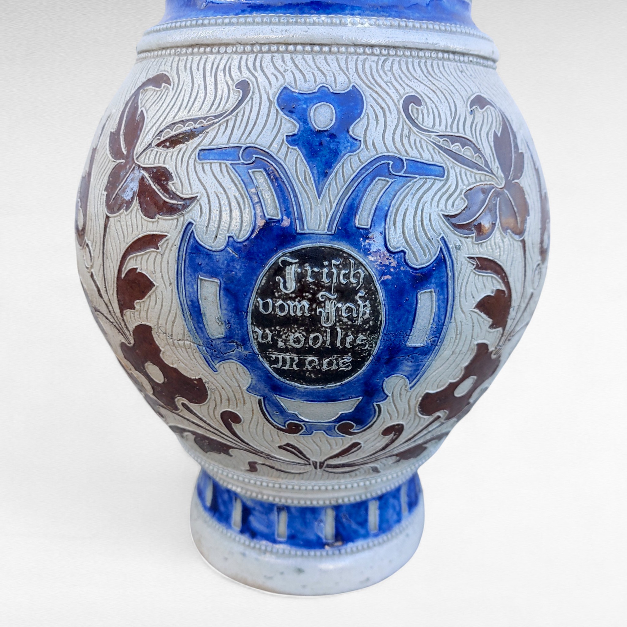 Akmens masės alaus ąsotis iš Westerwald regiono, gamintas XIX a. pab.–XX a. pradžioje. Pilkai druska glazūruotas paviršius, mėlyna kobalto juosta ir rudi reljefai . Ant kaklo pavaizduota groteskiška kaukė, korpuse gotiškas užrašas „Frisch vom Fass in volle Mass“ („Šviežiai iš statinės, į pilną taurę“). Būklė naudota, su natūraliais amžiaus ženklais, bet sveikas. Parvežta iš Prancūzijos.