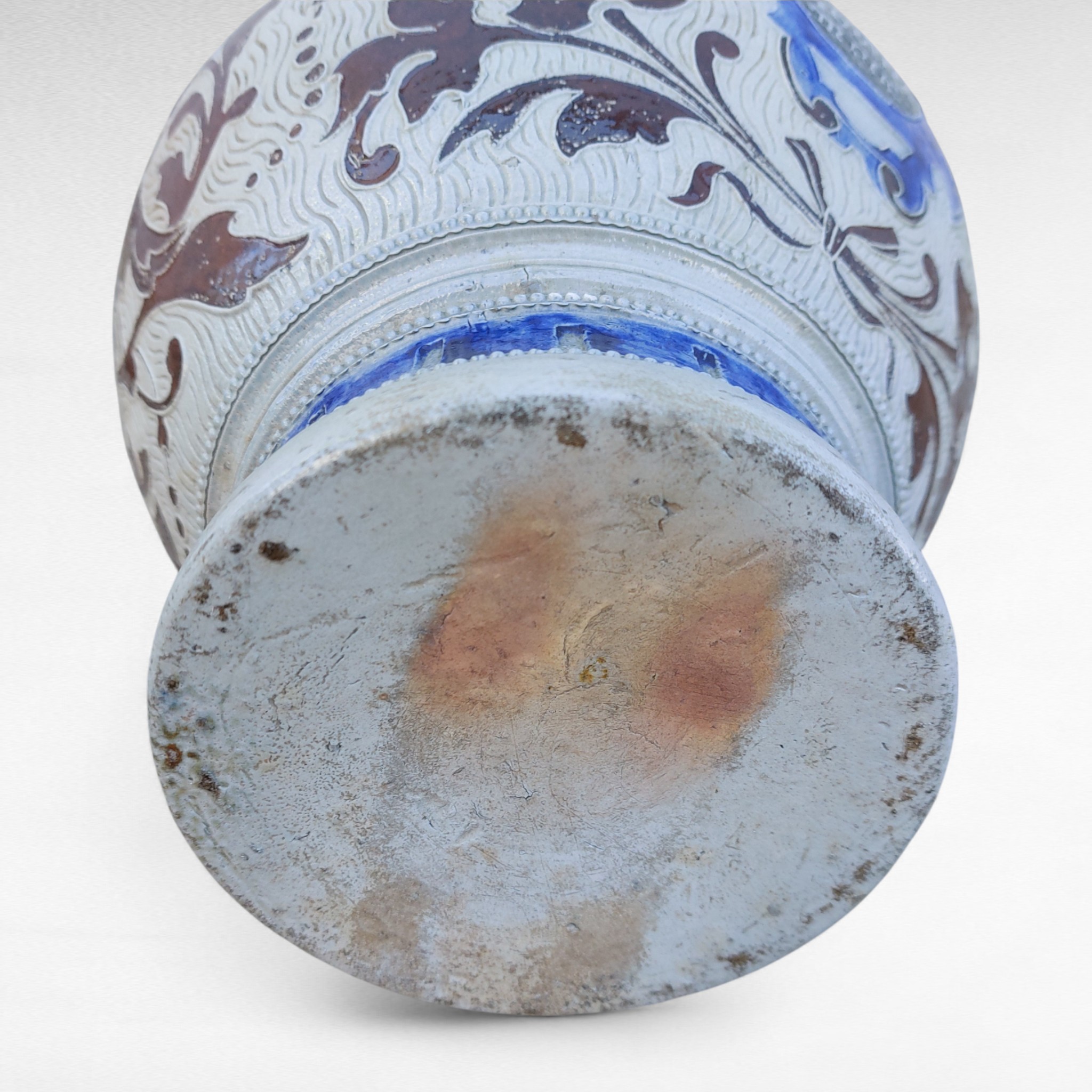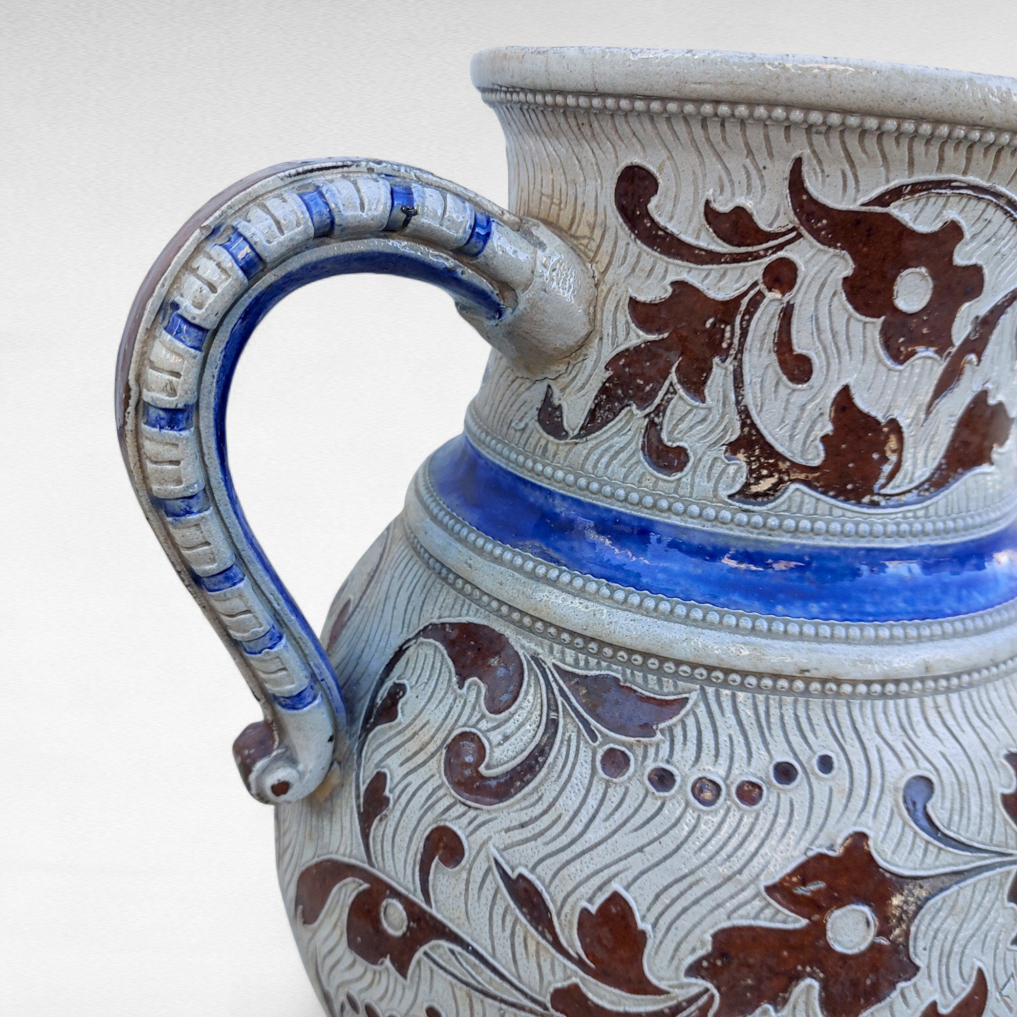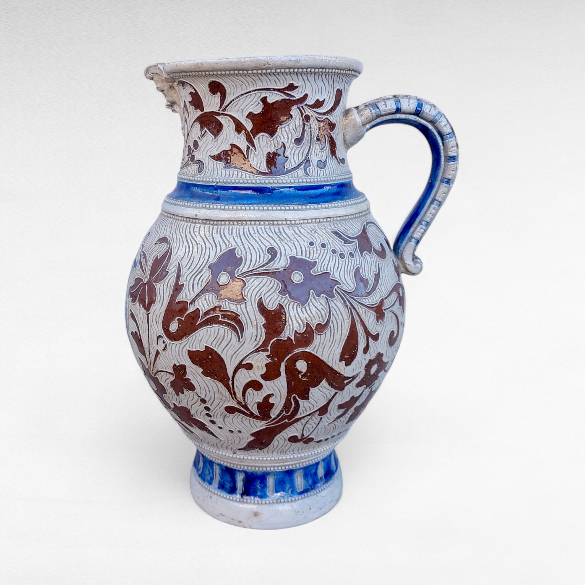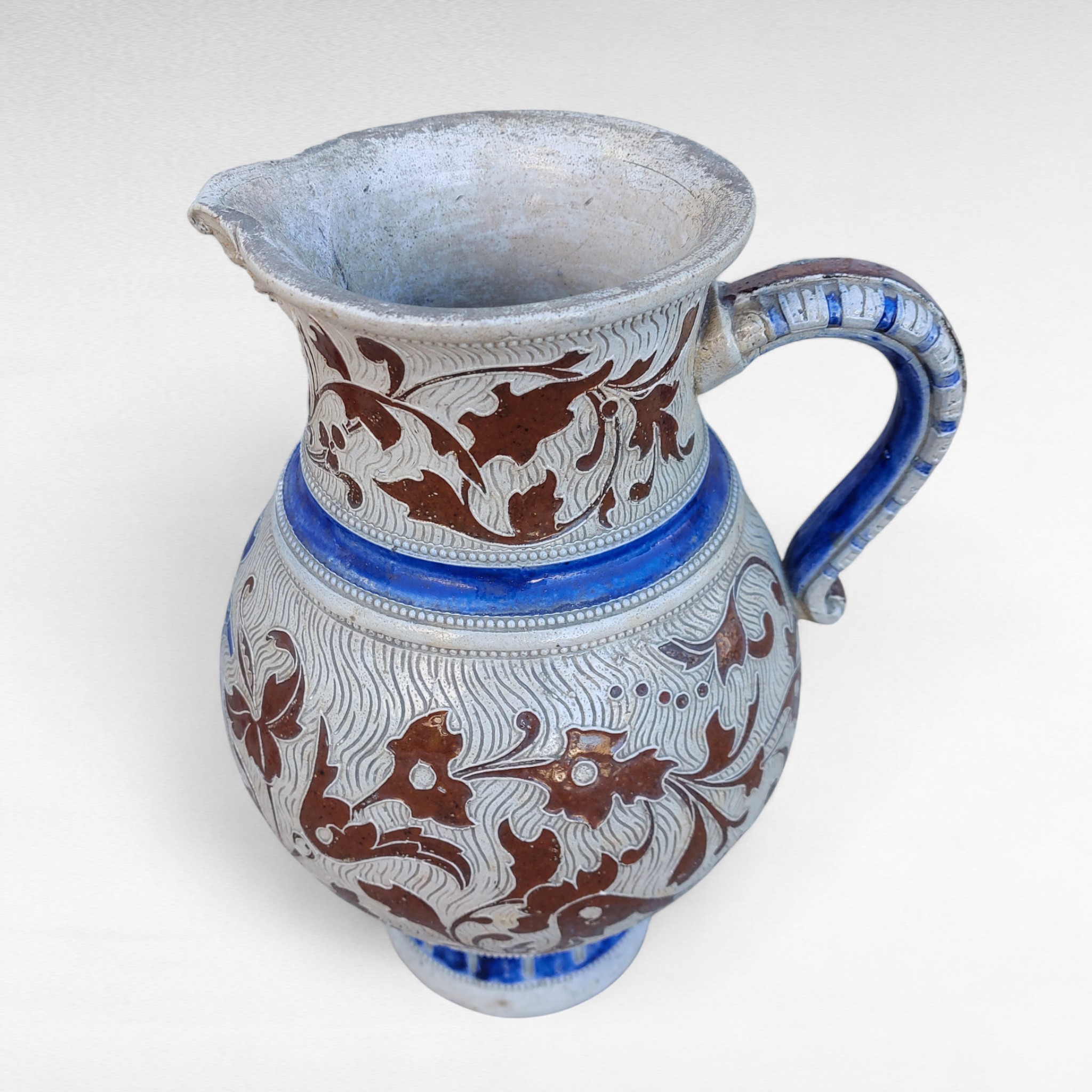 Akmens masės alaus ąsotis iš Westerwald regiono, gamintas XIX a. pab.–XX a. pradžioje. Pilkai druska glazūruotas paviršius, mėlyna kobalto juosta ir rudi reljefai . Ant kaklo pavaizduota groteskiška kaukė, korpuse gotiškas užrašas „Frisch vom Fass in volle Mass“ („Šviežiai iš statinės, į pilną taurę“). Būklė naudota, su natūraliais amžiaus ženklais, bet sveikas. Parvežta iš Prancūzijos.