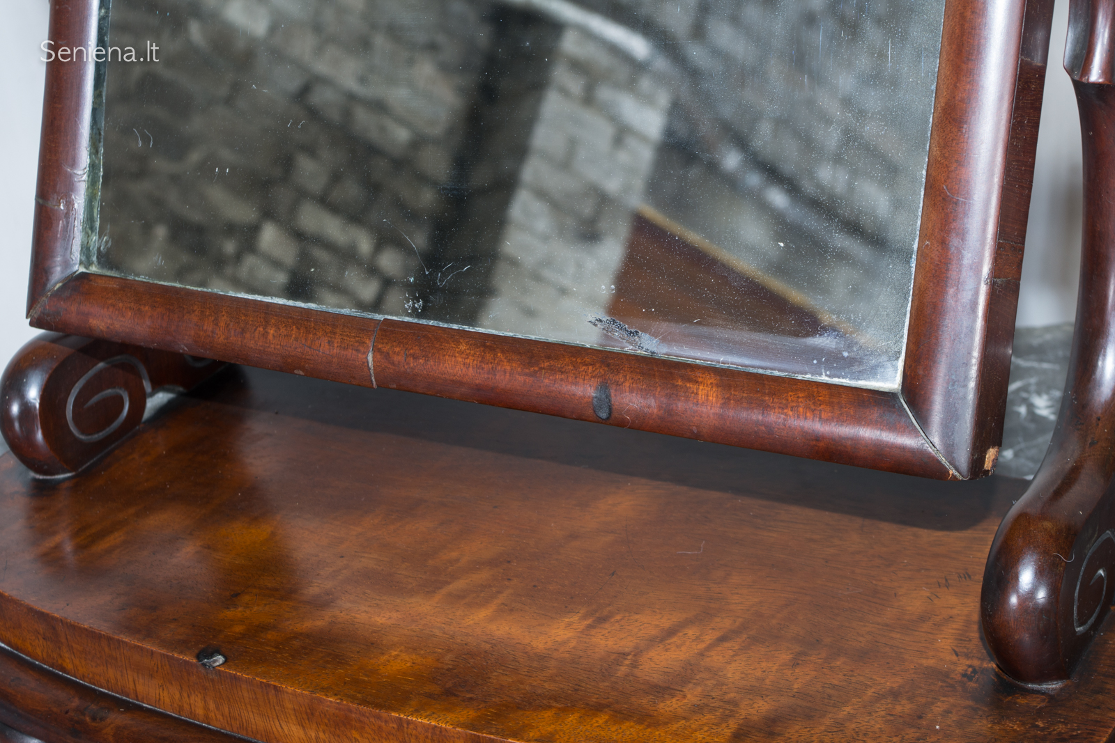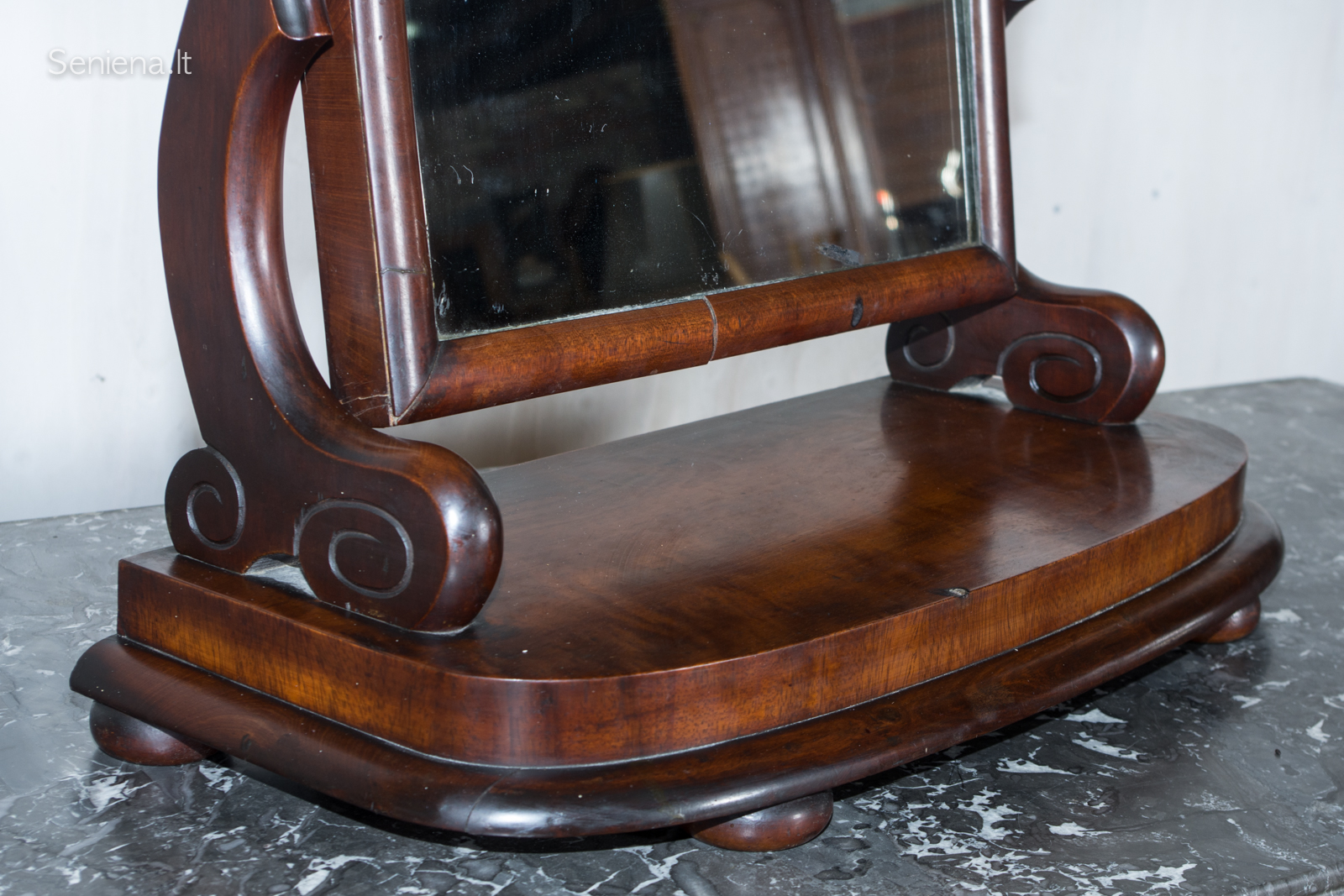 Pasvirimas reguliuojamas, mechanizmas veikia. Baldas stabilus, sunkus, skirtas statyti ant komodos ar tualetinio staliuko.