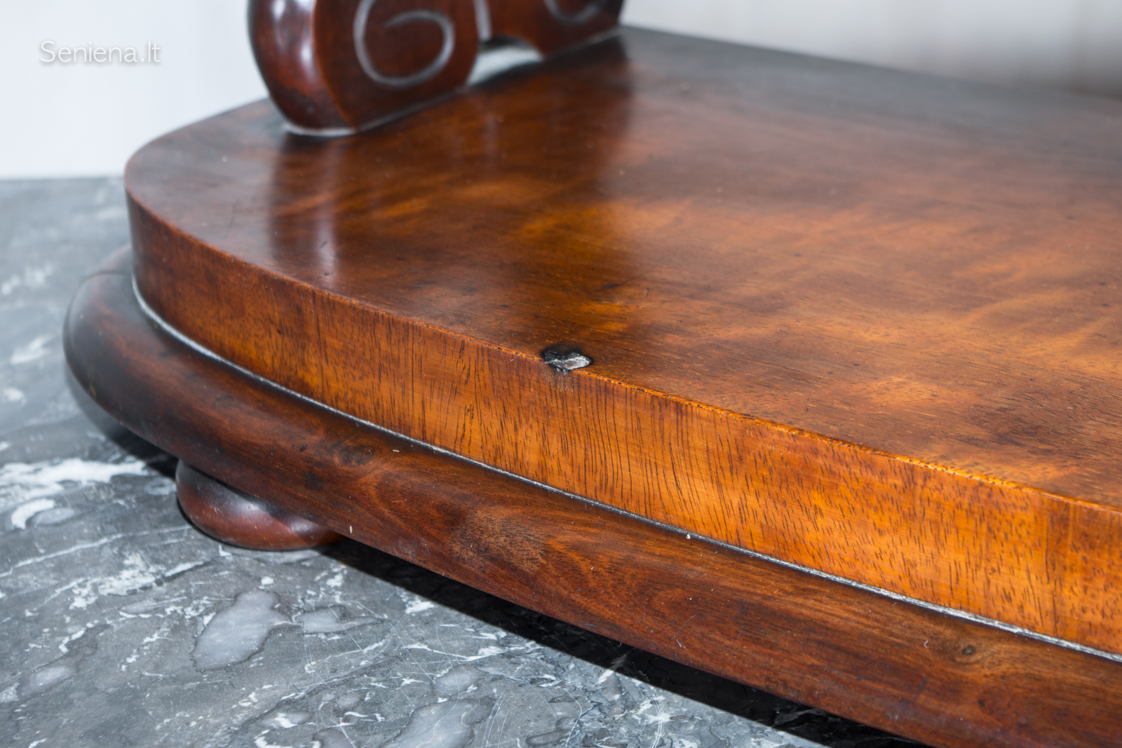 Medinis veidrodis su tvirtu, lenktu pagrindu ir išraiškingais šoniniais laikikliais. Pagamintas apie 1860 m., Prancūzijoje. Veidrodžio rėmas faneruotas riešuto lukštu, išlaikęs sodrią spalvą ir laikmečio detales. Stiklas originalus, su natūraliomis laiko žymėmis.